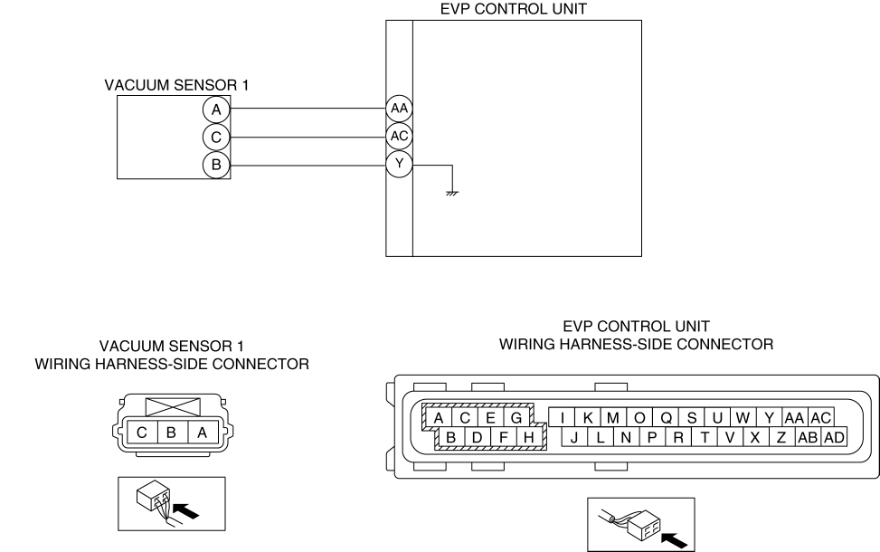 Refer to the wiring diagram and verify whether or not there is a common connector between vacuum sensor 1 terminal A and EVP control unit terminal AA.